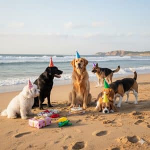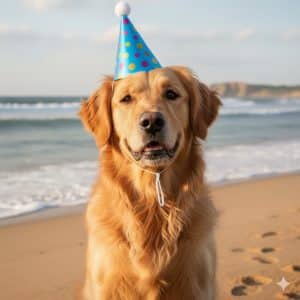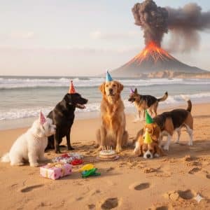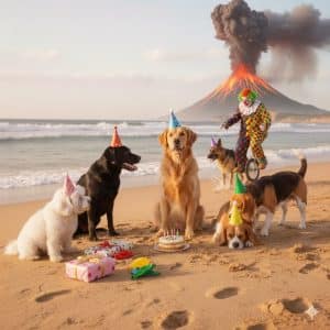 Now let’s start with a prompt that probably wouldn’t be copyrightable: “Make a dog”. Nice, image 1 is a golden retriever. Now let’s start iterating. I want the dog to be on the beach. “Please put the dog on the beach”. Kind of boring. Let’s have the dog wearing a birthday party hat: “Please have the dog wear a birthday party hat”. Nice, but not festive enough. “Please have other dogs at the party”. Let’s make it more interesting. “Add a volcano erupting in the distance.” Still not strange enough for me. “Please add a clown riding a unicycle in the background”. Perfect! My artwork is complete: