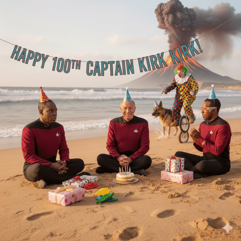 For educational purposes, let’s look at how the Star Trek example might play out as an image. I added “Now replace the dogs with Captain Picard, Worf, Commander Data and Commander LaForge, all celebrating Captain Kirk’s 100th birthday.”. It is pretty clear that Gemini has some guardrails, because it did not create the exact characters I asked for, but it still harkened back to Star Trek, and includes the copyrighted look and feel of the characters: