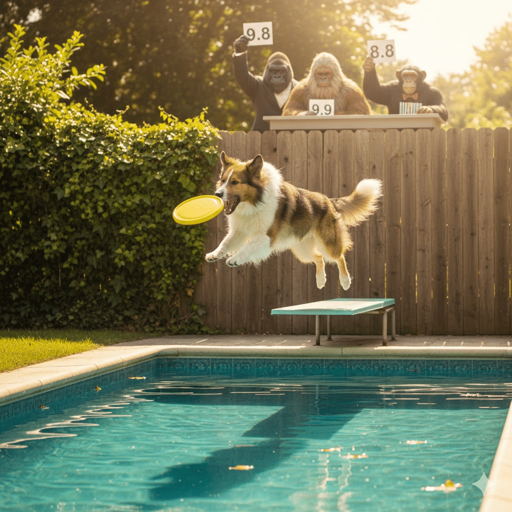 There is little question that a complex prompt itself can be copyrighted. The phrase “please create an image of a cute dog that is 1/4 collie and 3/4 german shepherd and is jumping off the diving board of a swimming pool, trying to catch a frisbee in her mouth; the pool is relatively narrow at the point where the diving board is located.; behind the diving board is a wooden fence with about 1 meter of ivy planting in front of it; it is a nice sunny day, and the color temperature should reflect that; in the background are three judges, a gorilla, a bigfoot, and a chimp holding up signs rating the dive (like at the olympics) with a score of 9.8, 9.9, and 8.8 respectively; there are a few scattered leaves floating in the pool; the frisbee is about 20 cm away from the dog’s mouth, and she is about to catch it” is copyrightable. The prompt has human creativity and is expressive enough to qualify. It follows that the image generated by that prompt would be a work of joint authorship, with portions generated by my prompt, and other portions filled in by the AI on its own. Let’s have a look at what Gemini 2.5 Pro does with that prompt: